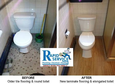 Hard water can be brutal on your plumbing fixtures. The minerals will corrode and eat away at the metals of your faucets, shower heads, and toilet parts. A shiny chrome finish will flake away and turn green. NOT the look our Hebron CT homeowner was going for! Even worse, a faucet can start to drip and a toilet can begin to leak. She knew she could count on us here at Rapid Service LLC to take care of leaky plumbing fixtures. We replaced the faucet and the sink in the bathroom. Her old toilet had been leaking underneath the tile floor for quite some time. Because Rapid Service is a plumber, electrician, heating specialist, AND carpenter, she didn't need to call anyone else. One call to us had her covered! The toilet flange was repaired properly, a new floor was installed, as well as the new toilet. We removed all of the trash and left her home without a trace. A few plumbing upgrades gave the bathroom a much needed update.